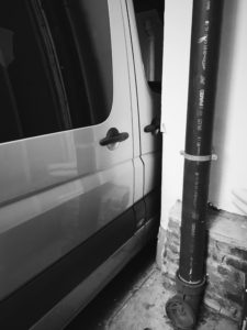 We komen aan bij een café op de hoek van een drukke straat. Nergens is een parkeerplaats vrij en de eigenaar van het
